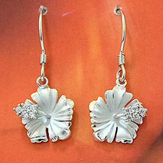 Hawaiian Hibiscus Earrings, Sterling Silver Hibiscus CZ Dangle Earrings, Hawaiian Jewelry, Christmas Anniversary Birthday Gift