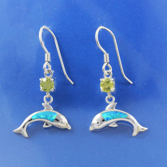 Hawaiian Genuine Peridot Blue Opal Dolphin Earrings, Sterling Silver Peridot Blue Opal Dolphin Dangle Earrings, Christmas Mom Birthday Gift