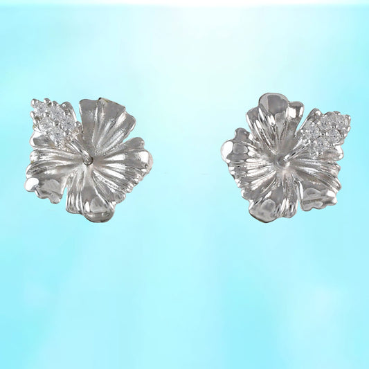 Hawaiian Hibiscus Earrings, Sterling Silver Hibiscus CZ Stud Earrings, Hawaiian Jewelry, Christmas Anniversary Birthday Gift