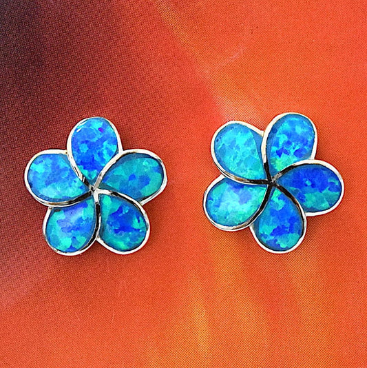 Hawaiian Blue Opal Plumeria Earrings, Sterling Silver Blue Opal Inlay Plumeria Stud Earrings, Hawaiian Christmas Mother Mom Birthday Gift