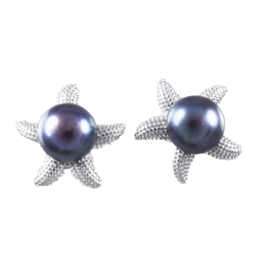 Hawaiian Genuine Black Pearl Starfish Earrings, Sterling Silver Black Pearl Starfish Stud Post Earrings, Hawaiian Birthday Mother Mom Gift