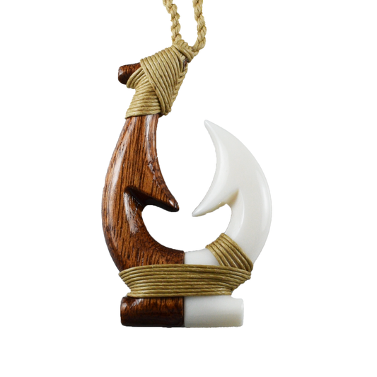 Hawaiian Large Genuine Koa Wood Fish Hook Necklace, Hand Carved Buffalo Bone 3D Fish Hook Necklace, N9404 -Paradise Treasures Jewelry