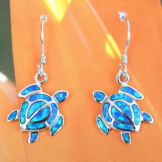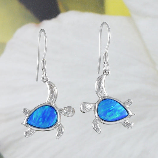Hawaiian Blue Opal Sea Turtle Earring, Sterling Silver Blue Opal Turtle Dangle Earring, E8406 Valentine Birthday Mom Gift