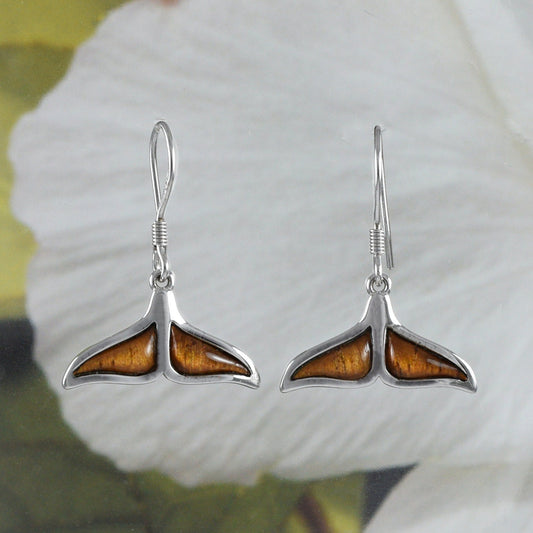 Hawaiian Large Genuine Koa Wood Whale Tail Earring, Sterling Silver Koa Wood Whale Tail Dangle Earring, E8426 Mother Wife Mom Gift