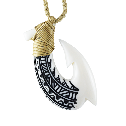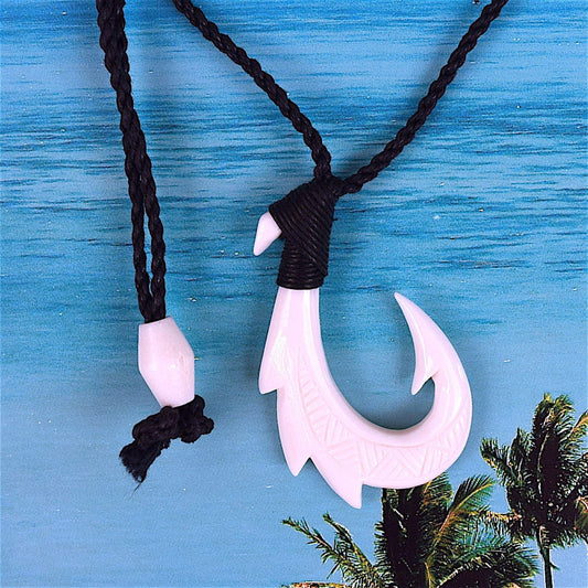 Hawaiian Large Fish Hook Necklace, Hand Carved Buffalo Bone 3D Fish Hook Necklace, N9113 - Paradise Treasures Jewelry