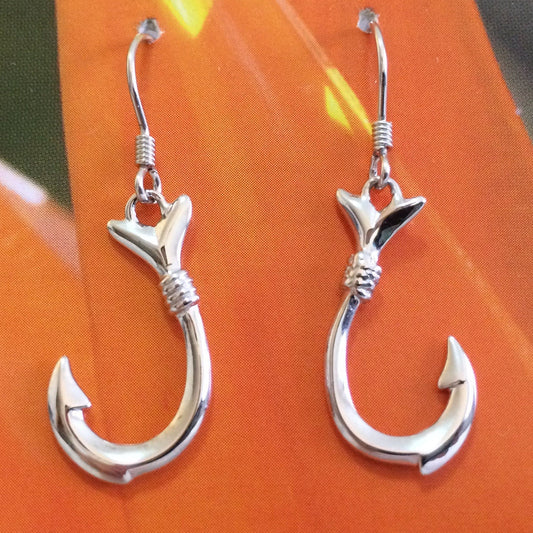 Hawaiian Large 3D Fish Hook Earrings, Sterling Silver Fish Hook Dangle Earrings, W4140 Mother Birthday Anniversary Gift