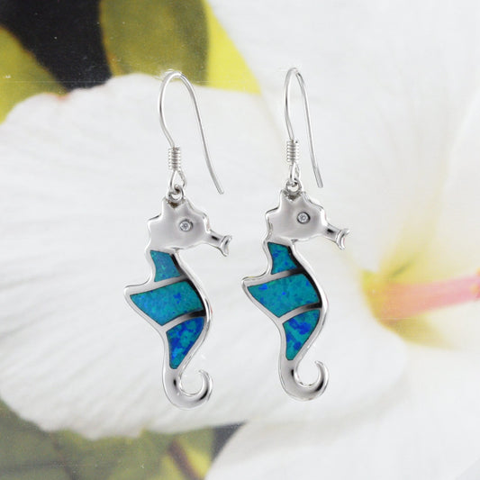 Hawaiian Large Blue Opal Seahorse Earrings, Sterling Silver Opal Sea Horse Dangle Earrings, E6167 Birthday Mother Mom Gift