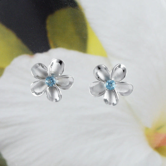 Hawaiian Genuine Blue Topaz Plumeria Earrings, Sterling Silver Plumeria Flower Stud Earrings, E8537 Birthday Wife Mom Mother Gift