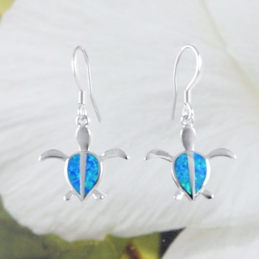 Hawaiian Blue Opal Sea Turtle Earrings, Sterling Silver Blue Opal Turtle Dangle Earrings, E8407 Mother Birthday Mom Gift