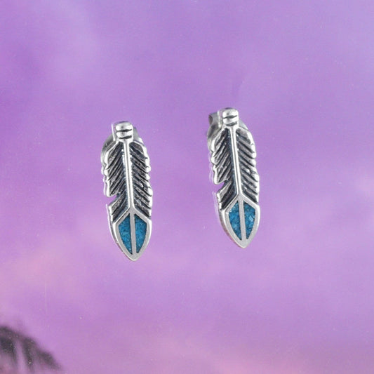 Genuine Turquoise Feather Earrings, Sterling Silver Feather Stud Earrings, E8398 Birthday Mother Gift, Texan Jewelry