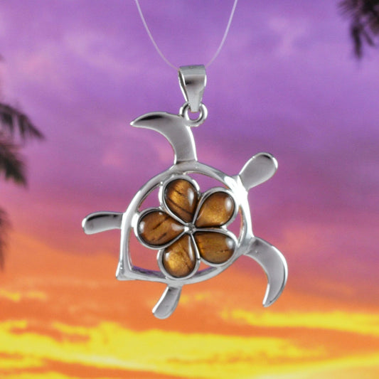 Hawaiian Large Genuine Koa Wood Sea Turtle Pendant, Sterling Silver Koa Wood Plumeria Turtle Pendant, N8506 Birthday Mom Gift