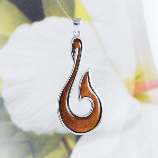 Hawaiian X-Large Genuine Koa Wood Fish Hook Pendant, Sterling Silver Fish Hook Pendant, N8862 Birthday Mother Gift