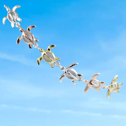 Hawaiian 3-Tone Sea Turtle Bracelet, Sterling Silver Yellow-Gold Plated Tri-color Turtle Bracelet, B3313 Birthday Mom Mother Gift