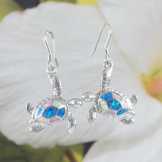 Hawaiian Large Tri-color Opal Sea Turtle Earrings, Sterling Silver Opal Turtle Dangle Earrings, E8401 Mother Birthday Mom Gift