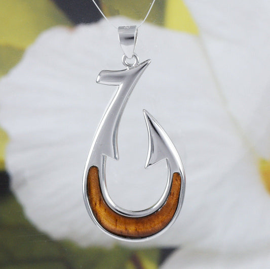 Hawaiian X-Large Genuine Koa Wood Fish Hook Pendant, Sterling Silver Fish Hook Pendant, N8516 Birthday Mother Gift