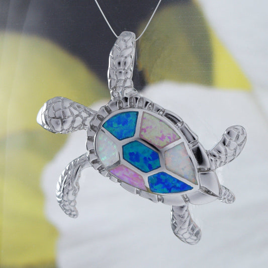 Hawaiian X-Large Tri-color Opal Sea Turtle Pendant, Sterling Silver Blue White Pink Opal Turtle Pendant, N8365 Birthday Mom Gift