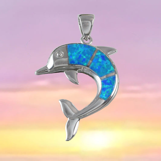 Hawaiian Large Blue Opal Dolphin Pendant, Sterling Silver Blue Opal Dolphin Pendant, N6030 Birthday Mother Mom Gift