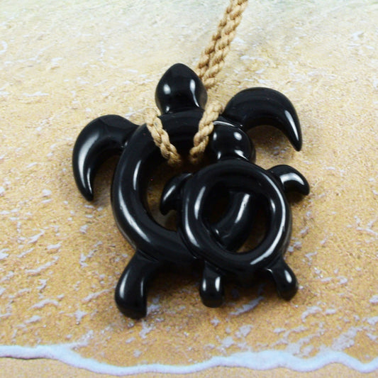 Hawaiian Mom & Small Sea Turtle Necklace, Hand Carved Buffalo Bone Black Sea Turtle Necklace, N9130 -Paradise Treasures Jewelry