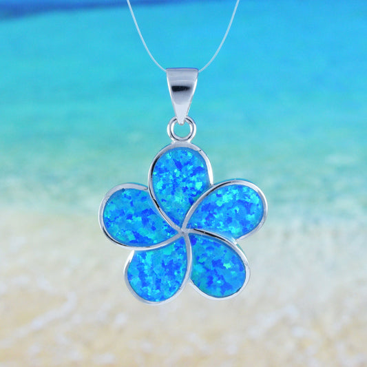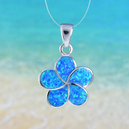 Hawaiian Blue Opal Plumeria Pendant, Silver Blue Opal Inlay Plumeria Pendant, Christmas Anniversary Birthday Mom Gift
