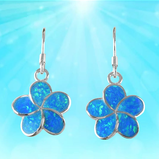 Hawaiian Blue Opal Plumeria Earrings, Sterling Silver Blue Opal Inlay Plumeria Dangle Earrings, Christmas Present Birthday Gift