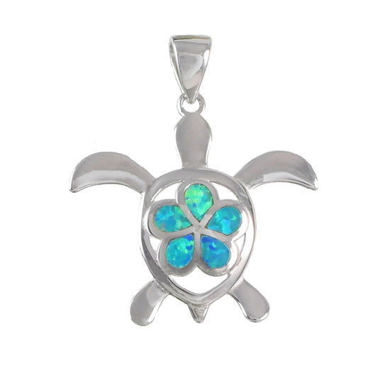 Hawaiian Large Plumeria Sea Turtle Pendant, Sterling Silver Turtle w. Blue Opal Plumeria Pendant, Christmas Birthday Gift