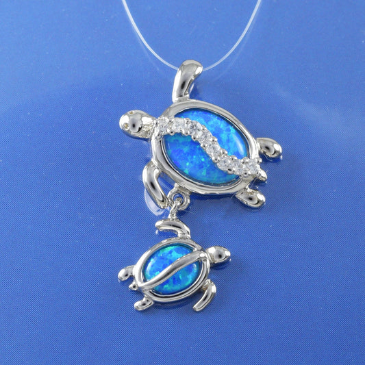 Hawaiian Blue Opal Mom and Small Sea Turtle Pendant, Sterling Silver Blue Opal Inlay Sea CZ Turtle Pendant, Christmas Birthday Gift