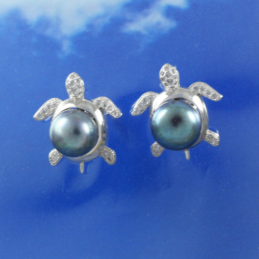 Hawaiian Genuine Black Pearl Sea Turtle Earrings, Sterling Silver Black Pearl CZ Sea Turtle Stud Post Earrings, Hawaiian Jewelry
