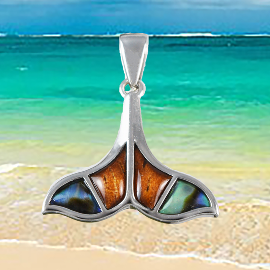 Genuine Koa Wood Abalone Whale Tail Pendant in Sterling Silver, N9477 Paradise Treasures Jewelry