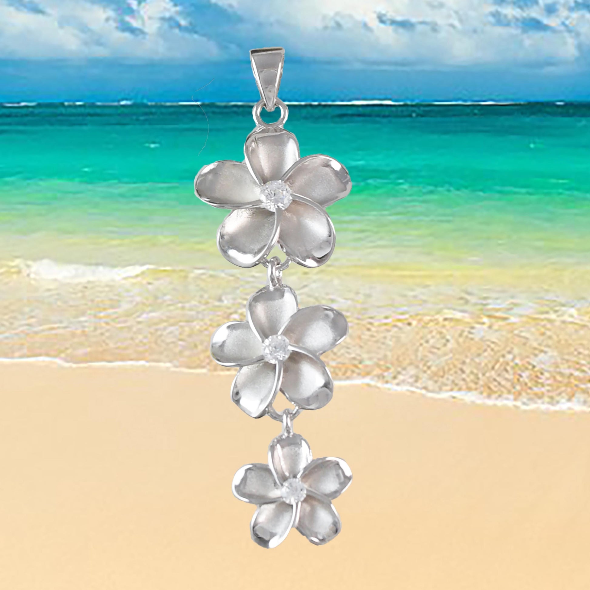 Hawaiian Large 3 Plumeria Pendant, Sterling Silver 3 Plumeria CZ Pendant, Hawaiian Jewelry, Christmas Anniversary Birthday Gift