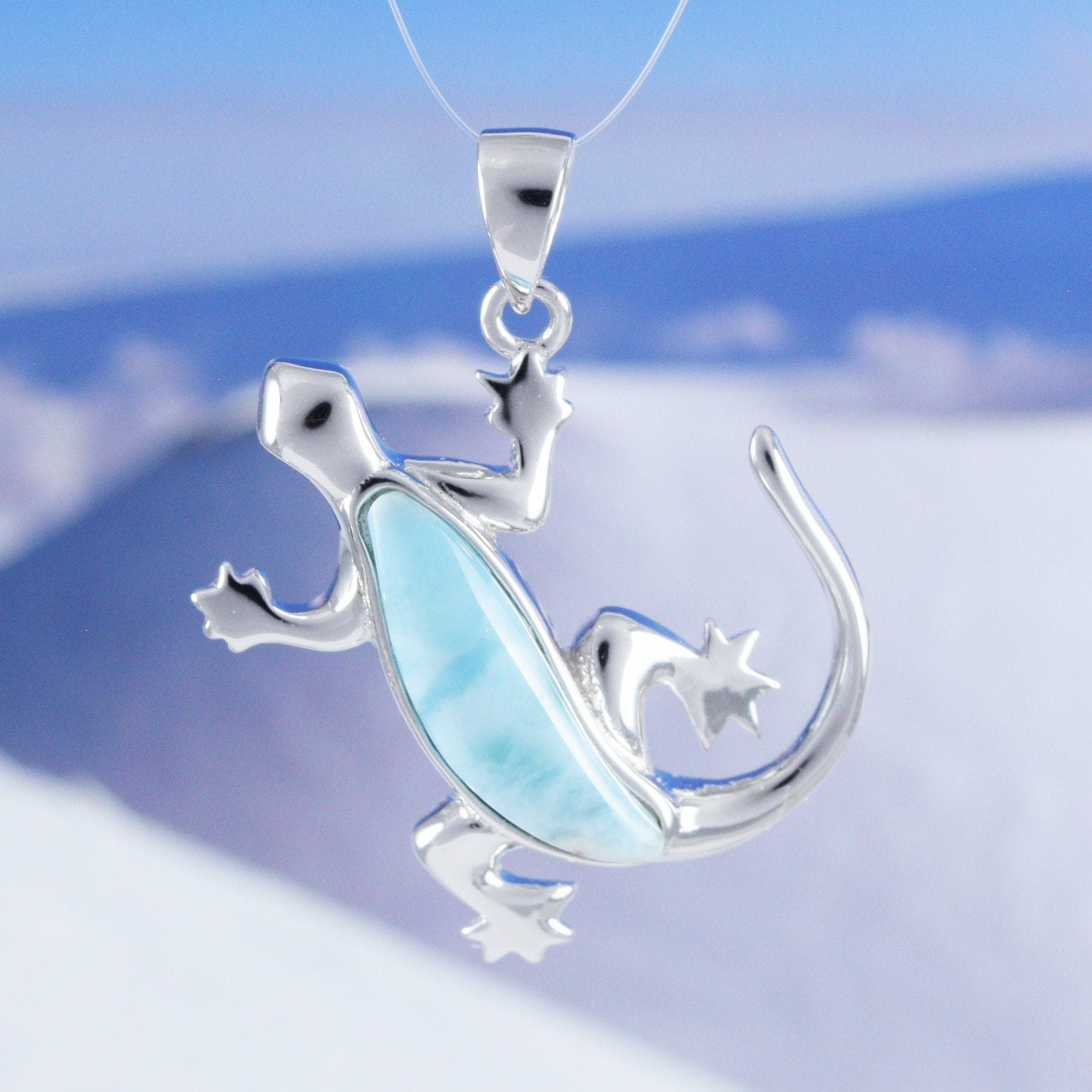 Hawaiian Large Genuine Larimar Gecko Pendant, Sterling Silver Larimar Gecko Lizard Pendant, Christmas Anniversary Mom Birthday Gift