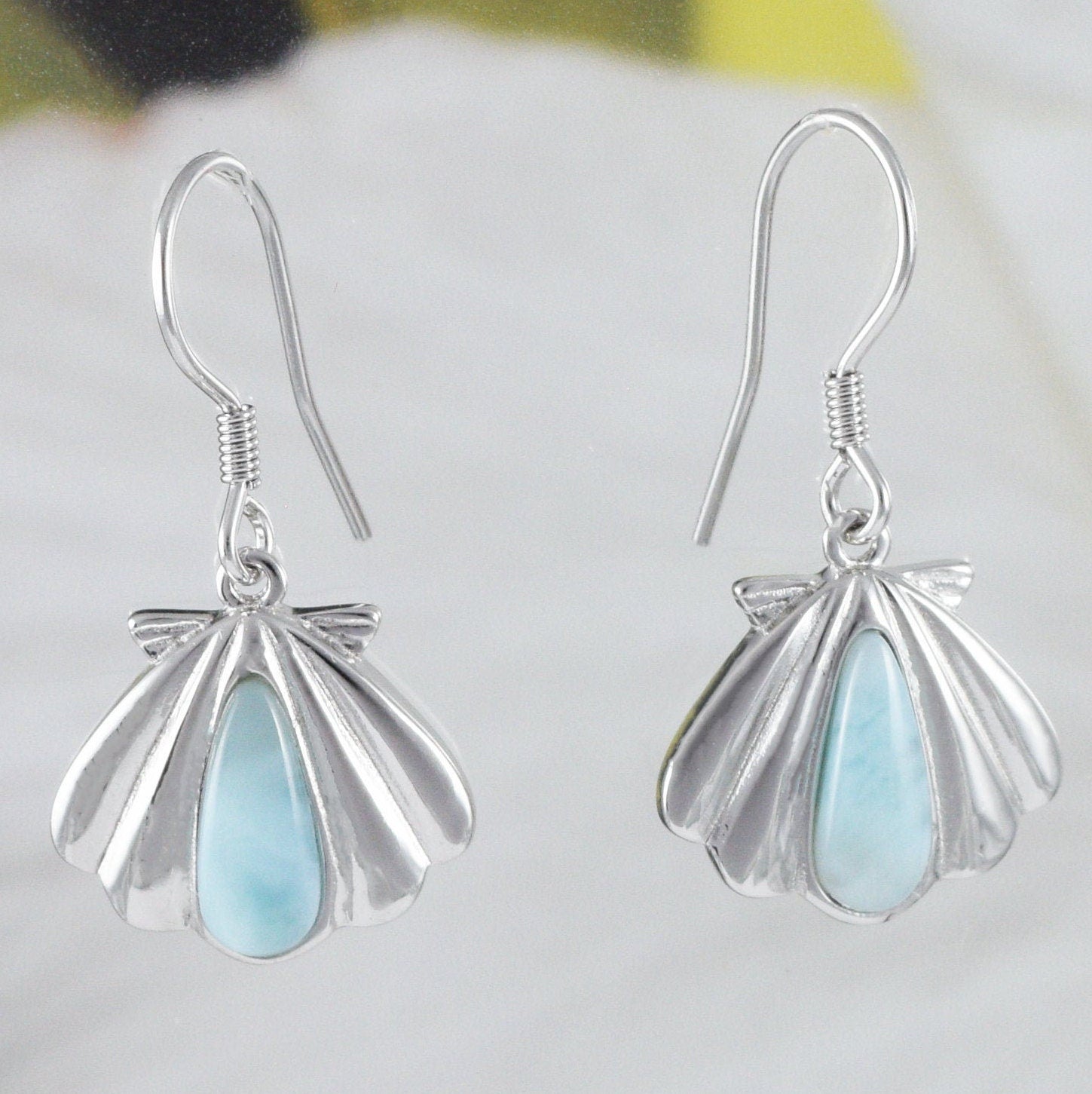 Hawaiian Genuine Larimar Seashell Earrings, Sterling Silver Larimar Sea Shell Dangle Earrings, E8476 Birthday Mom Gift