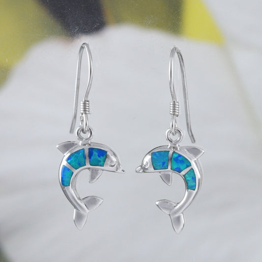 Beautiful Hawaiian Blue Opal Dolphin Earrings, Sterling Silver Blue Opal Dolphin Dangle Earrings, E4030 Birthday Wife Mom Mother Gift