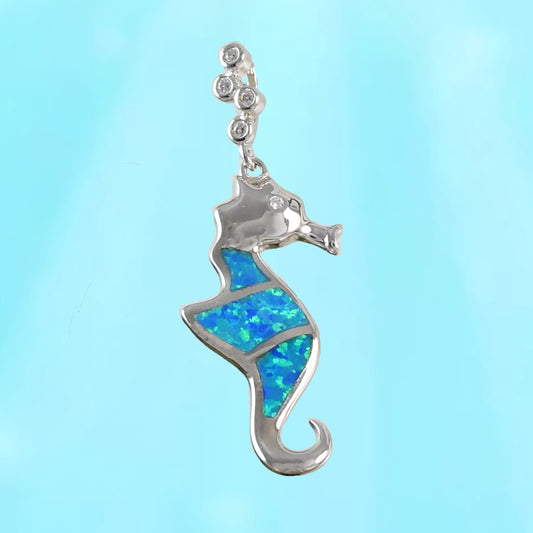 Hawaiian Blue Opal Seahorse Pendant, Sterling Silver Blue Opal Sea Horse CZ Pendant, Christmas Anniversary Birthday Mom Gift