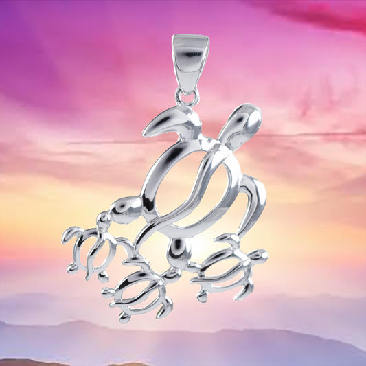 Hawaiian X-Large Mom & 3 Small Sea Turtle Pendant, Sterling Silver Sea Turtle Family Pendant, N6170 Birthday Wife Mom Gift