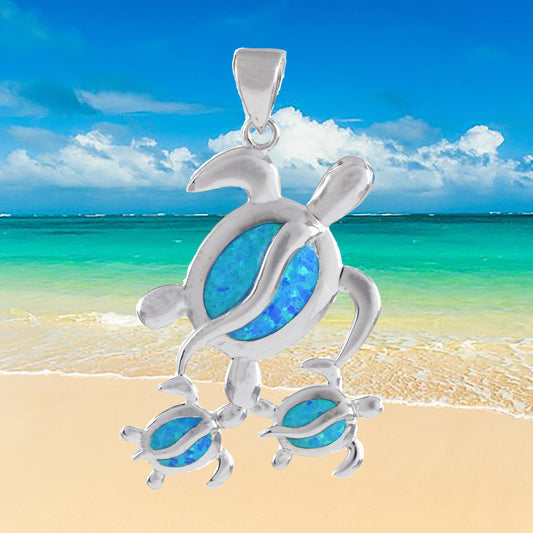 Hawaiian Blue Opal Mom & Small Sea Turtle Pendant, Sterling Silver Blue Opal Turtle Pendant, Christmas Birthday Mom Gift